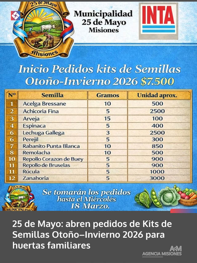 AGENCIA MISIONES.UNO | La Secretaría del Agro y la Producción de la Municipalidad de 25 de Mayo informó que se encuentra abierta la recepción de pedidos de los Kits de Semillas Otoño–Invierno 2026, con un valor de $7.500 por unidad y modalidad de pago adelantado presencial.