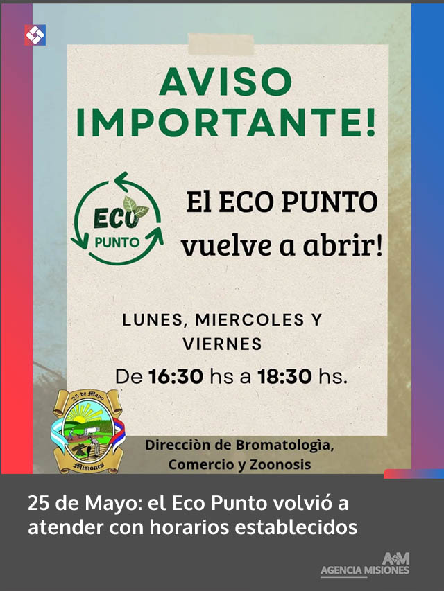 AGENCIA MISIONES.UNO | La Municipalidad de 25 de Mayo informó que el Eco Punto retomó su atención habitual para recibir materiales reciclables de los vecinos.