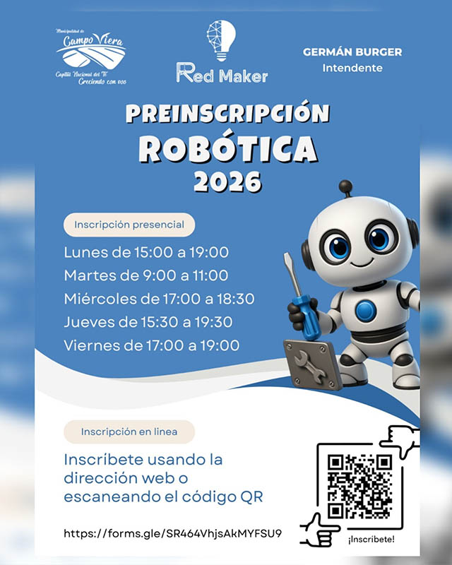 AGENCIA MISIONES.UNO | La Municipalidad de Campo Viera informó que ya se encuentra habilitada la preinscripción para la propuesta educativa Robótica 2026, en el marco de la Red Maker local.