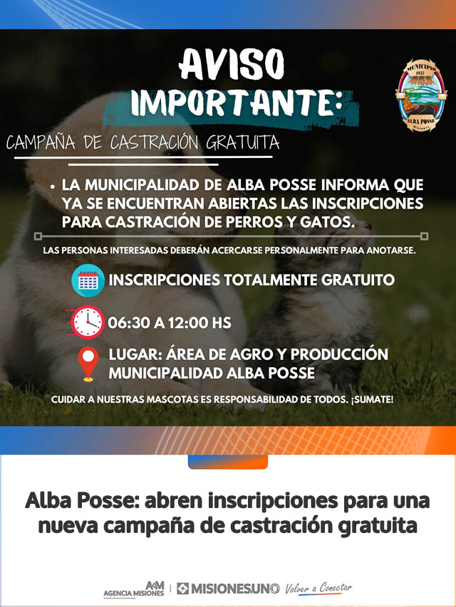 AGENCIA MISIONES.UNO | La Municipalidad de Alba Posse informó que se encuentran abiertas las inscripciones para acceder a castraciones gratuitas de perros y gatos, en el marco de una campaña de cuidado animal.