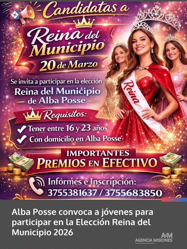 AGENCIA MISIONES.UNO | La Municipalidad de Alba Posse lanzó la convocatoria para participar en la Elección Reina del Municipio 2026, que se realizará el próximo 20 de marzo, e invita a jóvenes de la comunidad a sumarse a la propuesta.