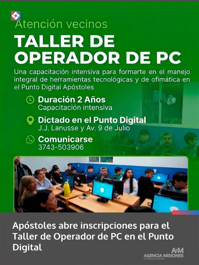 AGENCIA MISIONES.UNO | La Municipalidad de Apóstoles anunció la apertura de inscripciones para el Taller de Operador de PC, una propuesta de formación orientada a brindar herramientas digitales para el estudio y el trabajo.
