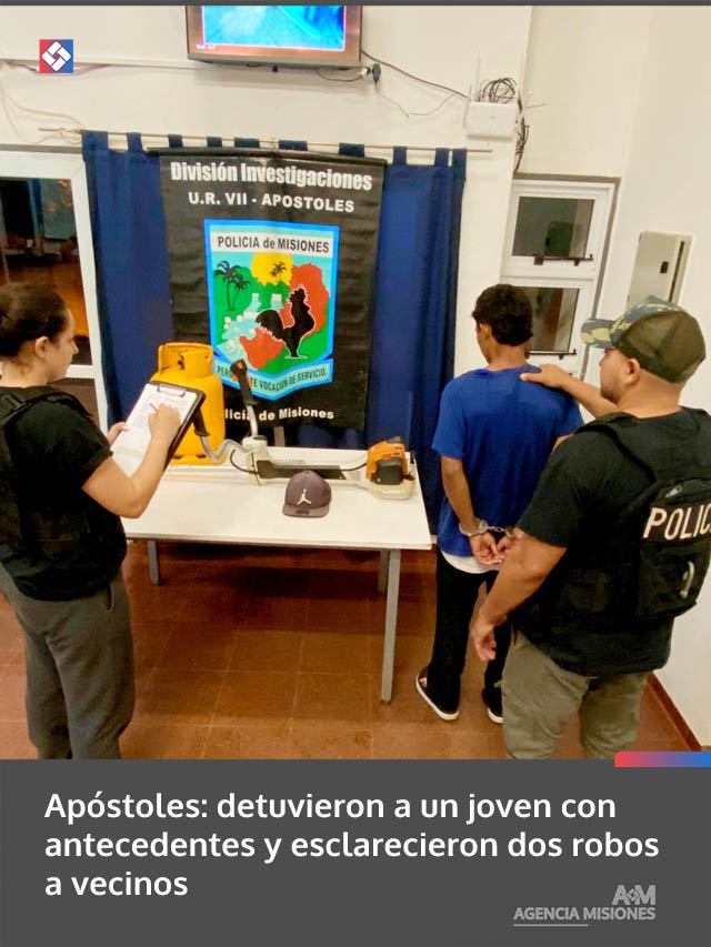 AGENCIA MISIONES.UNO | Efectivos de la Policía de Misiones detuvieron en Apóstoles a un joven de 24 años investigado por dos delitos contra la propiedad denunciados por vecinos de la ciudad. Durante el procedimiento también recuperaron los elementos sustraídos.