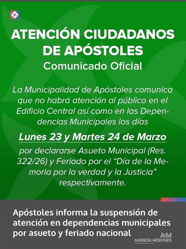 AGENCIA MISIONES.UNO | La Municipalidad de Apóstoles comunicó que no habrá atención al público en el edificio central ni en las distintas dependencias municipales durante los días lunes 23 y martes 24 de marzo, en el marco de un asueto municipal y un feriado nacional.