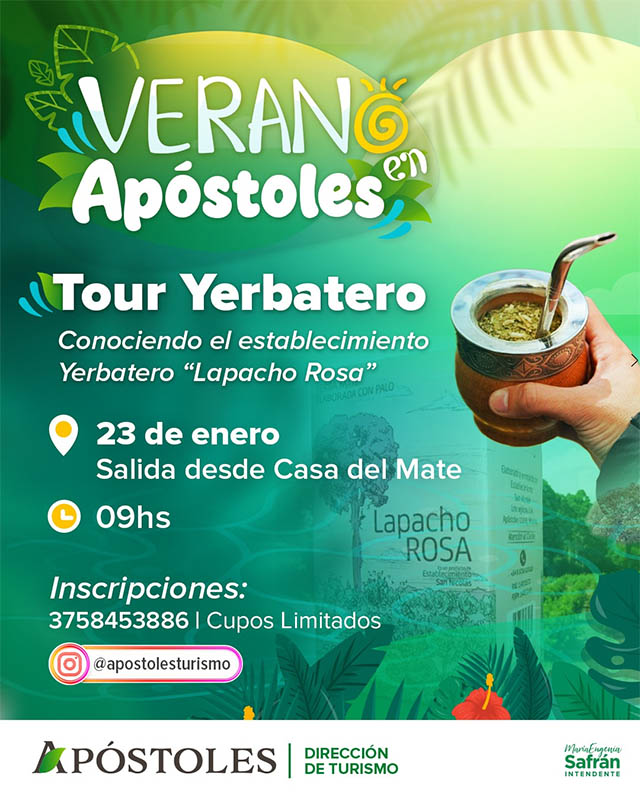 La actividad se desarrollará el jueves 23 de enero, con salida prevista a las 9 horas desde la Casa del Mate. La jornada incluye una visita al establecimiento Lapacho Rosa, donde los participantes podrán interiorizarse sobre el proceso productivo y los aspectos culturales vinculados a la yerba mate.