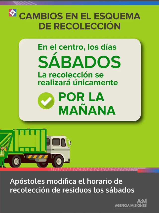 AGENCIA MISIONES.UNO | La Municipalidad de Apóstoles informó que a partir de este 28 de marzo se implementará un nuevo horario para la recolección de residuos los días sábados, que se realizará únicamente durante la mañana en todos los barrios de la ciudad.