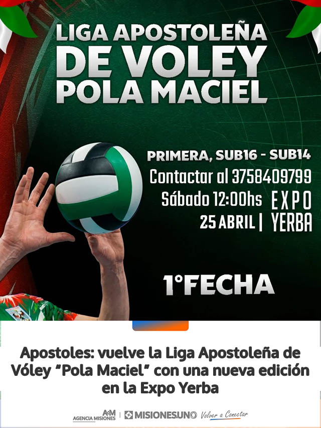 La Municipalidad de Apóstoles anunció el inicio de una nueva edición de la Liga Apostoleña de Vóley “Pola Maciel” 2026, que se pondrá en marcha este sábado 25 a partir de las 12 horas en el predio de la Expo Yerba.