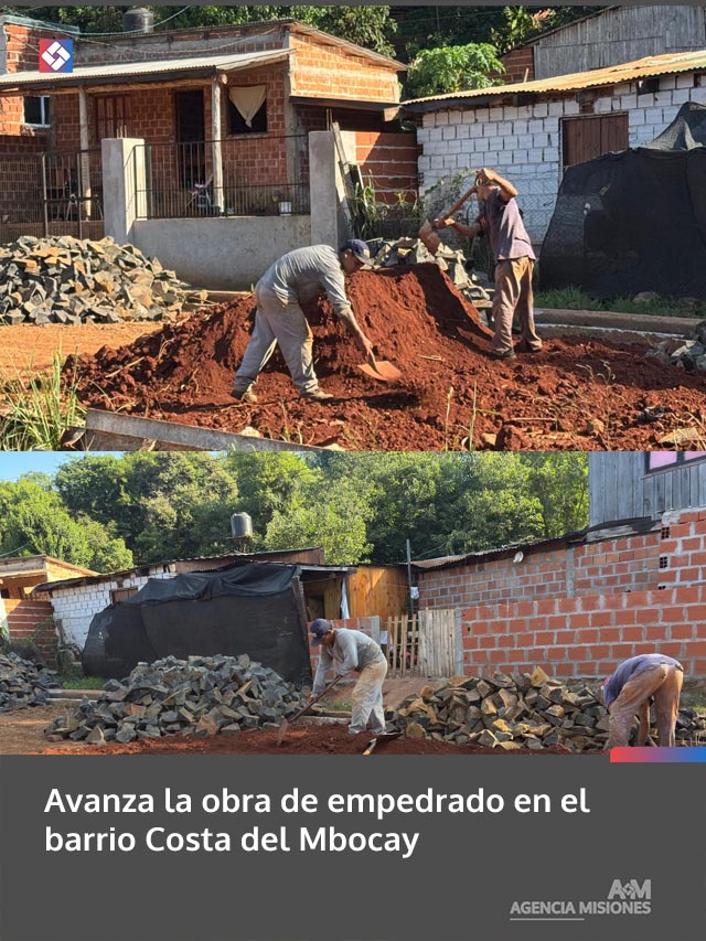 AGENCIA MISIONES.UNO | El equipo de Obras Públicas de Puerto Iguazú continúa con la construcción de empedrado en la intersección de avenida Posadas y Mónica Rodas, en el barrio Costa del Mbocay, una intervención que busca mejorar la transitabilidad y la calidad de vida de los vecinos.