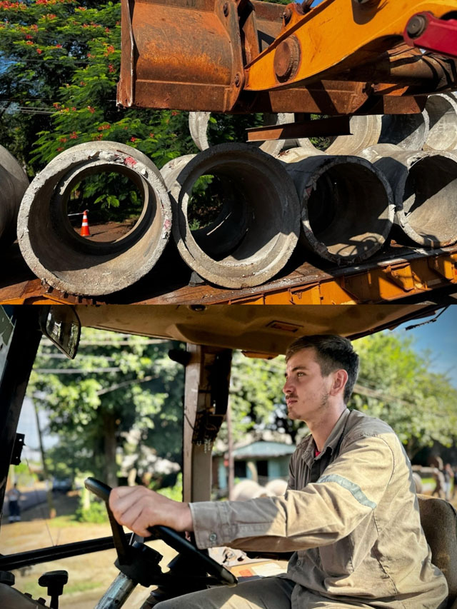 Durante la jornada, el equipo llevó adelante la descarga de tubos que serán utilizados en la ejecución del sistema de desagüe, una intervención que busca optimizar el escurrimiento del agua en la zona y prevenir inconvenientes durante lluvias intensas.