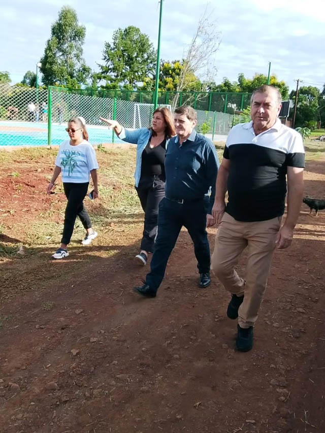 El intendente Rodolfo “Neco” Kuinaschuk, junto al secretario de Gobierno Walter Alvez, recibió a la coordinadora de la Unidad Ejecutora Provincial en Misiones, Adriana Bezus, y al ministro de Hacienda, Adolfo Safrán. Durante la jornada, inspeccionaron los avances del playón deportivo ubicado en el barrio 27 de Agosto.