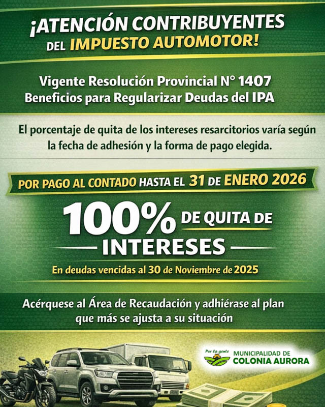 AGENCIA MISIONES.UNO | La Municipalidad de Colonia Aurora informó que se encuentra vigente la Resolución Provincial N° 1407, que establece beneficios para el pago de deudas atrasadas del Impuesto Provincial Automotor.