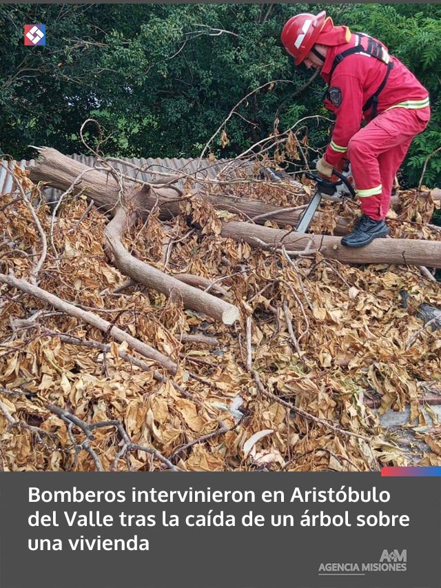 AGENCIA MISIONES.UNO | Una dotación de la División Bomberos intervino este 9 de marzo en Aristóbulo del Valle para retirar un árbol que cayó sobre una vivienda ubicada en la intersección de las calles Carlos Pellegrini y Estrada.
