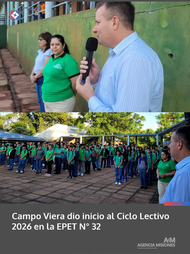 AGENCIA MISIONES.UNO | El intendente Germán Burger encabezó el acto de apertura del Ciclo Lectivo 2026 en Campo Viera, realizado en las instalaciones de la EPET N° 32, acompañado por la Coordinadora del Área de Educación.