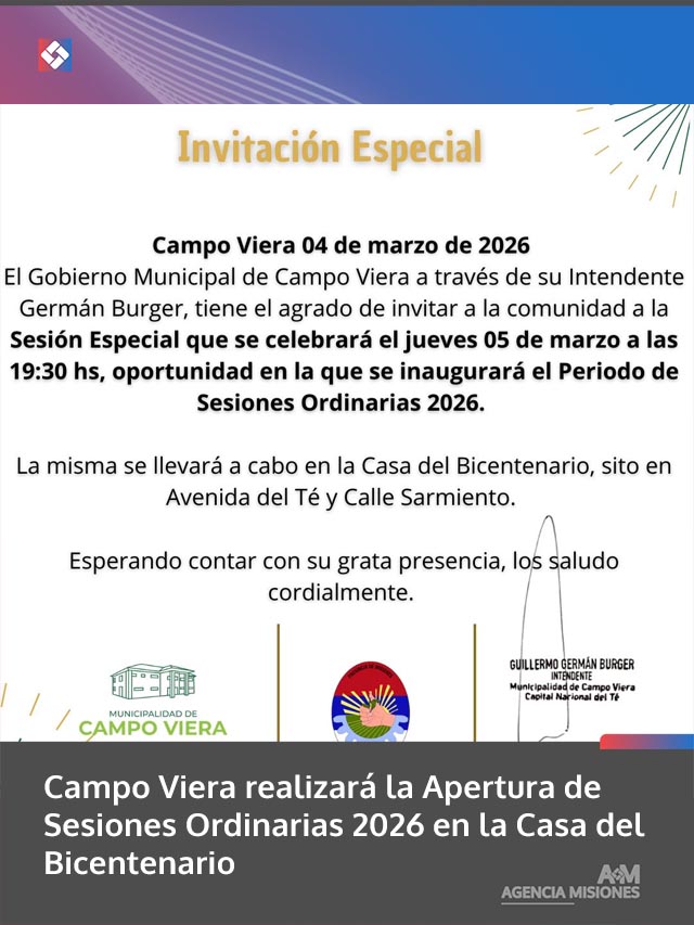 AGENCIA MISIONES.UNO | El intendente Germán Burger invitó a la comunidad de Campo Viera a participar del Acto de Apertura del Período de Sesiones Ordinarias 2026 del Honorable Concejo Deliberante, que se llevará a cabo el jueves 5 de marzo a las 19:30 en la Casa del Bicentenario.