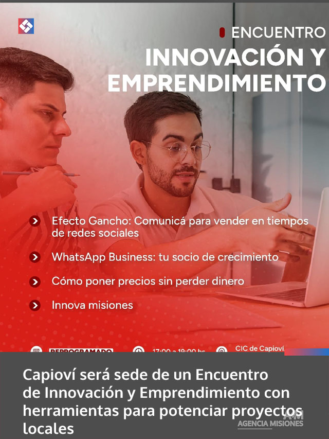 AGENCIA MISIONES.UNO | El próximo miércoles 8 de abril, a partir de las 17.00 horas, se realizará en el CIC de Capioví el Encuentro de Innovación y Emprendimiento, una propuesta libre y gratuita orientada a brindar herramientas prácticas para fortalecer iniciativas locales.