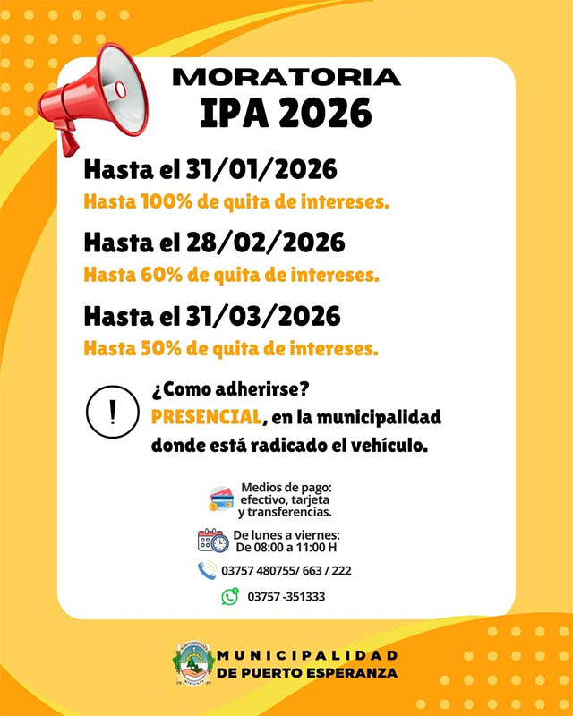 Puerto Esperanza recuerda la vigencia de la moratoria IPA 2026 con importantes quitas