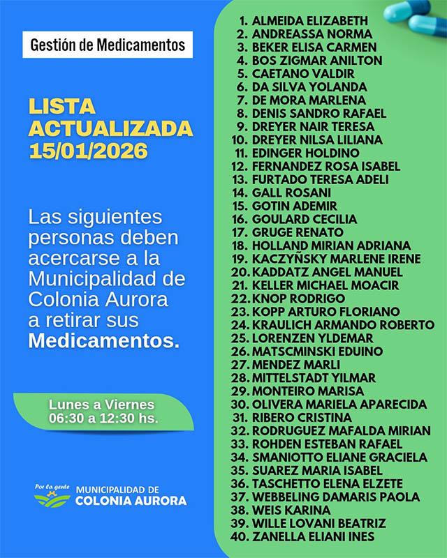 AGENCIA MISIONES.UNO | La Municipalidad de Colonia Aurora informó que continúa realizando gestiones para facilitar el acceso a medicamentos a vecinos a través del Programa Incluir Salud y de la Carpeta Especial destinada a personas sin beneficios.