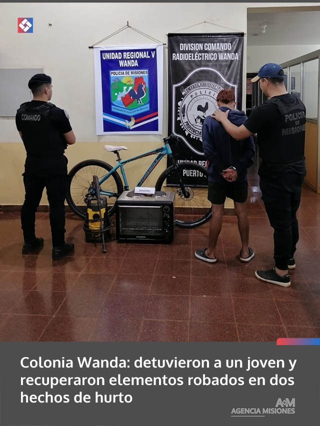 AGENCIA MISIONES.UNO | La Policía de Misiones esclareció dos hechos de hurto en Colonia Wanda, donde un joven de 20 años fue detenido y se recuperaron varios elementos sustraídos, entre ellos una bicicleta, una hidrolavadora y un horno eléctrico.