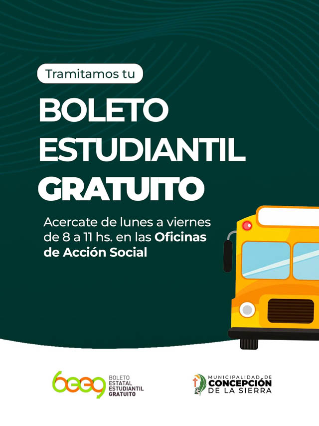 AGENCIA MISIONES.UNO | La Municipalidad de Concepción de la Sierra informó que ya se encuentra disponible la gestión del Boleto Estudiantil Gratuito, en el marco de las acciones previas al inicio del ciclo lectivo.