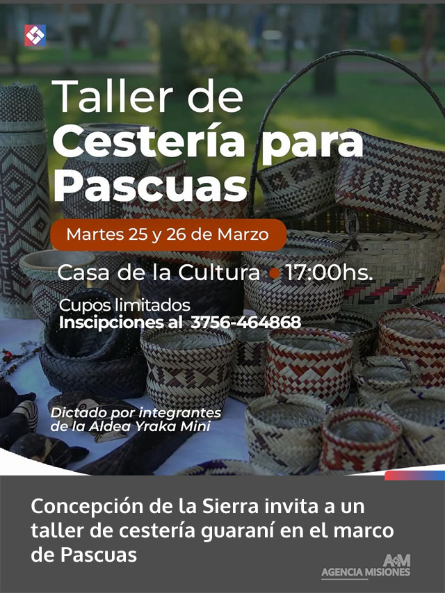 En el marco de las actividades por Pascuas, en Concepción de la Sierra se realizará un taller de cestería guaraní, orientado a quienes deseen conocer y aprender este arte ancestral. La iniciativa propone una experiencia práctica en la que los participantes podrán desarrollar sus propias piezas, guiados por técnicas tradicionales.