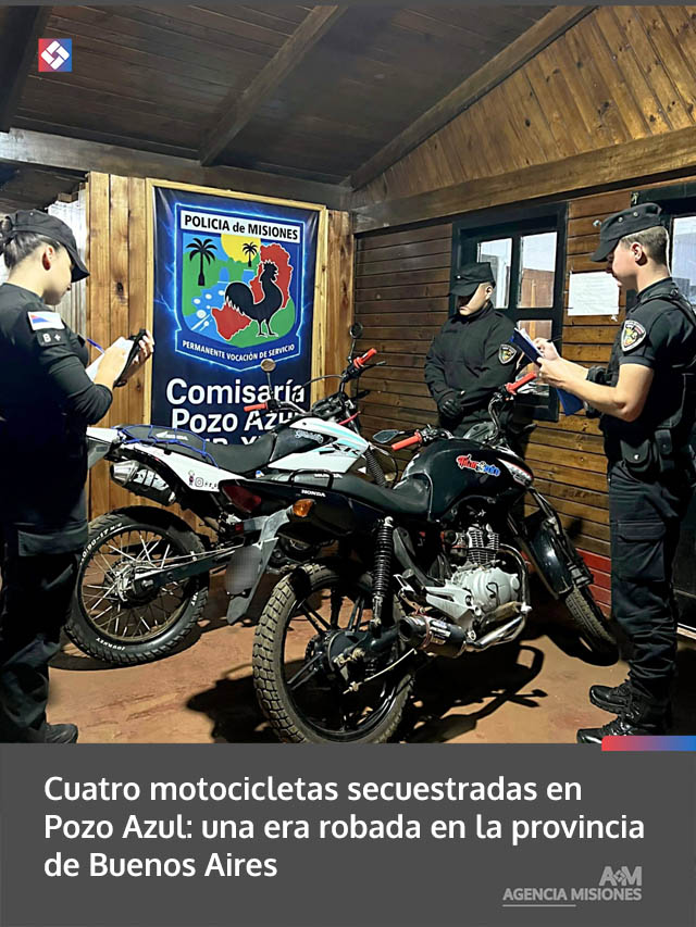 AGENCIA MISIONES.UNO | En un operativo preventivo desplegado en la localidad de Pozo Azul, la Policía de Misiones logró el secuestro de cuatro motocicletas en el transcurso de pocas horas. Entre los rodados incautados, los efectivos detectaron una unidad que registraba un pedido de secuestro vigente por hurto en la provincia de Buenos Aires, mientras que las demás circulaban con irregularidades graves.