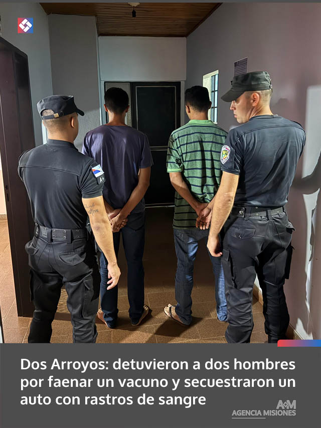 AGENCIA MISIONES.UNO | La Policía de Misiones detuvo a dos hombres acusados de abigeato en Dos Arroyos y secuestró el vehículo que habrían utilizado, donde se detectaron rastros compatibles con sangre tras una prueba de luminol.