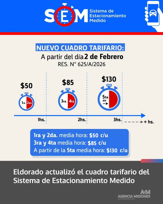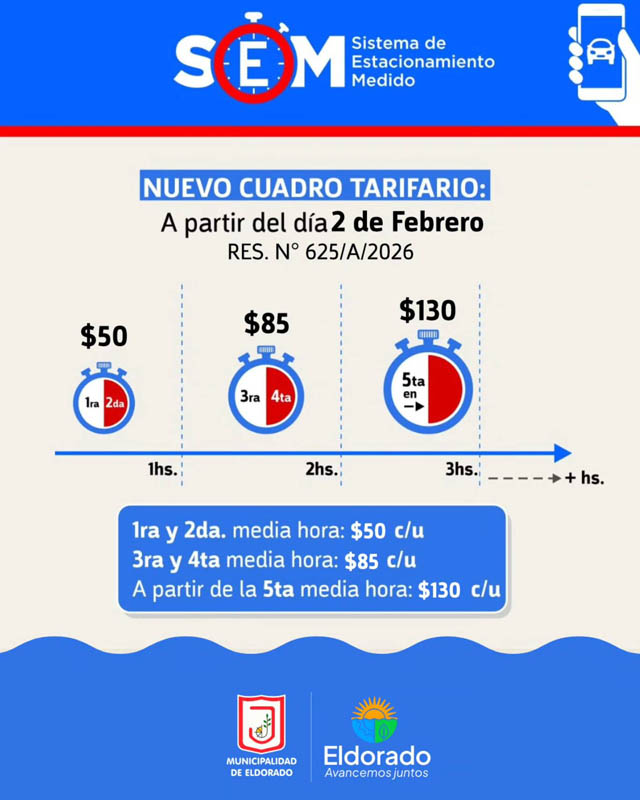 AGENCIA MISIONES.UNO | La Municipalidad de Eldorado informó la puesta en vigencia de un nuevo esquema de valores para el Sistema de Estacionamiento Medido, conforme a lo establecido por la Resolución N° 625/A/2026.
