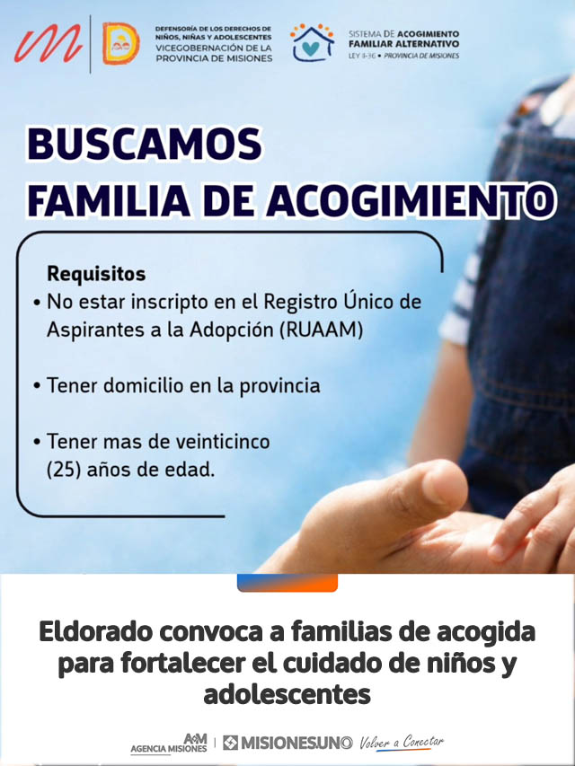 La Municipalidad de Eldorado, a través de la Dirección de Niñez y Adolescencia, lanzó una convocatoria destinada a familias interesadas en formar parte del Sistema de Acogimiento Familiar Alternativo.