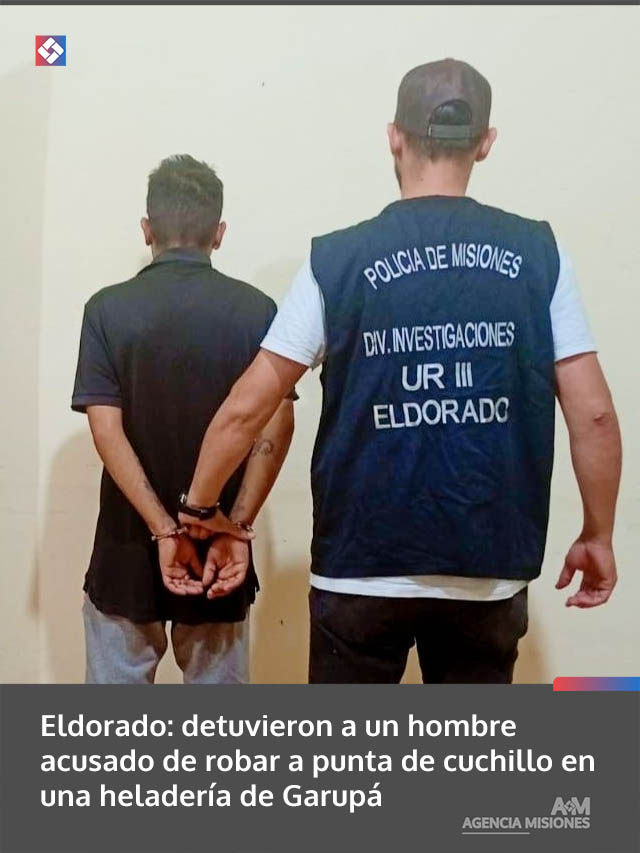 AGENCIA MISIONES.UNO | Un hombre de 40 años fue arrestado en Eldorado tras ser identificado como el presunto autor de un robo calificado ocurrido días atrás en una heladería de Garupá, donde amenazó a una empleada con un cuchillo y sustrajo dinero en efectivo y teléfonos celulares.