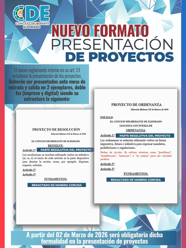 El Concejo Deliberante de Eldorado informó que se encuentra vigente un nuevo formato para la presentación de proyectos, en el marco de la actualización de su reglamento interno.