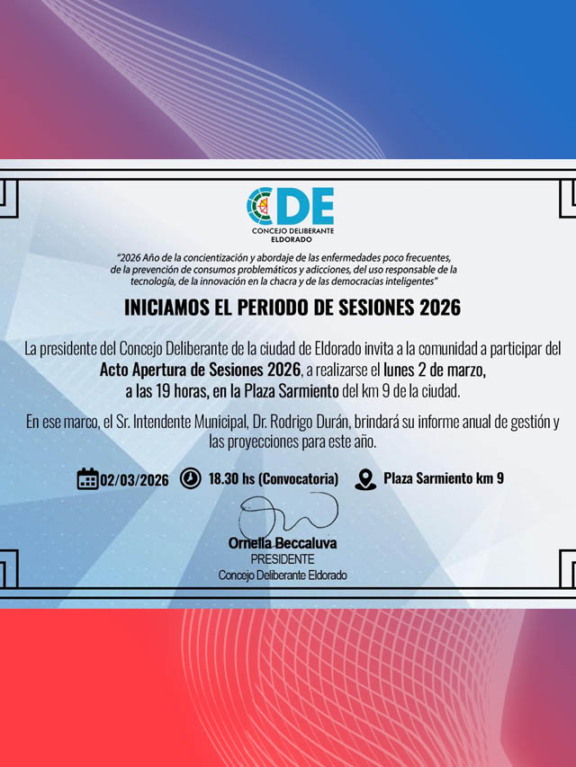 AGENCIA MISIONES.UNO | La presidente del Concejo Deliberante de Eldorado, Dra. Ornella Becaluva, convocó a la comunidad a participar del Acto de Apertura de Sesiones 2026, que se realizará el lunes 2 de marzo a las 19 horas en la Plaza Sarmiento del km 9. En la ocasión, el intendente Dr. Rodrigo Dúran brindará su informe anual de gestión y presentará los proyectos previstos para este año.