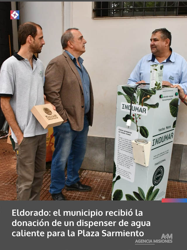 El intendente de Eldorado, Dr. Rodrigo Durán, agradeció a la empresa Indumar por la donación de un dispenser de agua caliente que será instalado en la Plaza Sarmiento, uno de los espacios más concurridos de la ciudad.