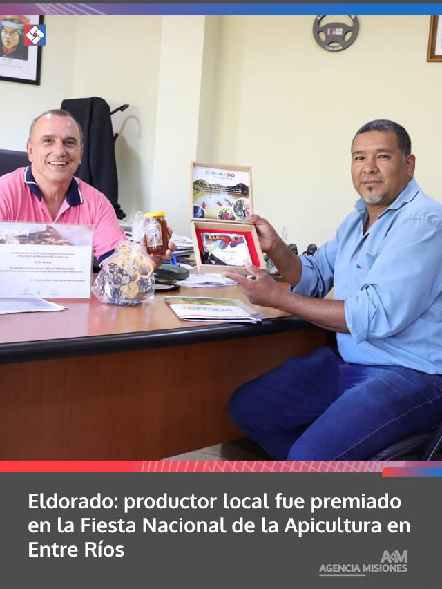 AGENCIA MISIONES.UNO | El intendente de Eldorado, Rodrigo Durán, recibió al productor local Diego Rivaldi, quien obtuvo el segundo puesto en el Concurso Internacional de Mieles durante la 29° Fiesta Nacional de la Apicultura y Expo Apícola del Mercosur, realizada en Maciá, Entre Ríos.