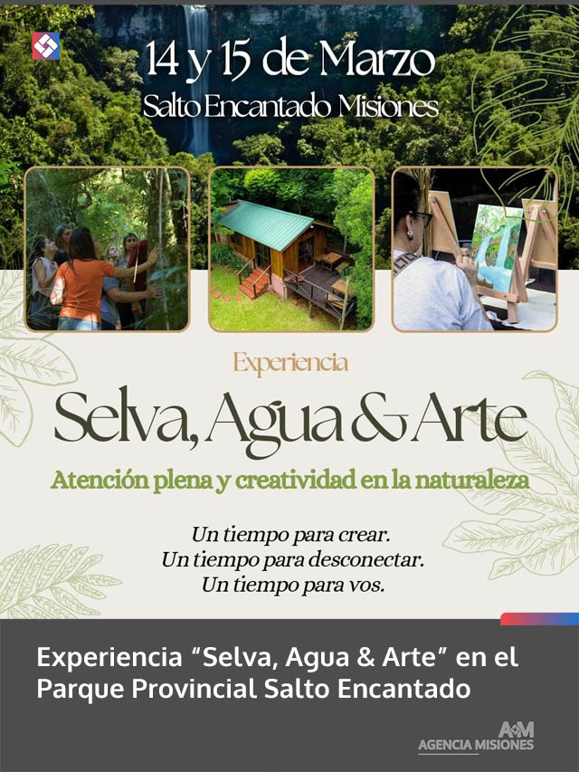 AGENCIA MISIONES.UNO | El sábado 14 y domingo 15 de marzo se realizará la experiencia “Selva, Agua & Arte” en el Parque Provincial Salto Encantado, una propuesta de dos días y una noche que combina naturaleza, descanso y creatividad en plena selva misionera.