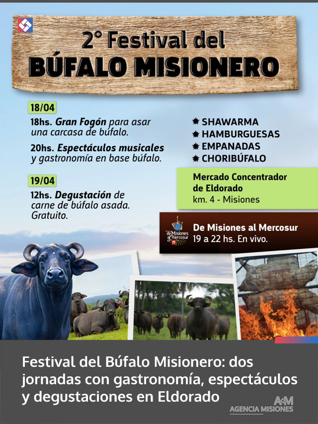 El domingo 19 de abril, las actividades continuarán desde el mediodía con una degustación gratuita de carne de búfalo asada, pensada para que el público pueda conocer y apreciar este producto característico de la región. En paralelo, se desarrollará la transmisión en vivo del programa “De Misiones al Mercosur”, entre las 19 y las 22 horas, sumando contenido cultural y de difusión regional.