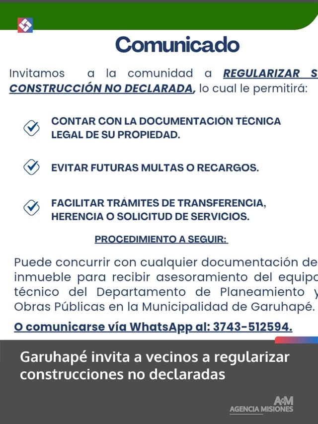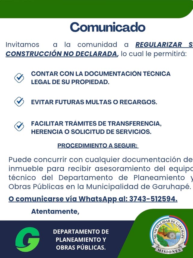 AGENCIA MISIONES.UNO | El Departamento de Planeamiento y Obras Públicas de la Municipalidad de Garuhapé convocó a los vecinos a regularizar las construcciones que no hayan sido declaradas, con el objetivo de ordenar y actualizar los registros municipales vinculados a edificaciones en la localidad.