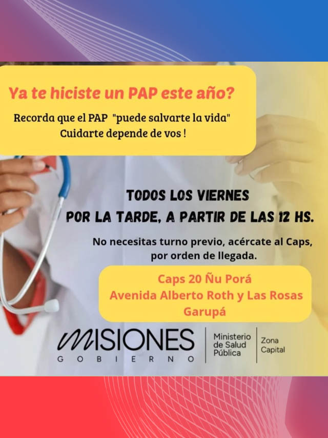 En el marco de las acciones de prevención y promoción de la salud, todos los viernes de marzo por la tarde, a partir de las 12 horas, se realizarán estudios de Papanicolaou (PAP) sin necesidad de turno previo. La atención será por orden de llegada y desde la cartera sanitaria recuerdan que el PAP es un estudio fundamental para la detección temprana de posibles lesiones vinculadas al cáncer de cuello uterino.