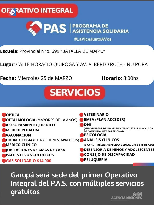 El primer Operativo Integral del Programa de Asistencia Solidaria P.A.S.-Posadas, dependiente de la Vicegobernación, se llevará a cabo el miércoles 25 de marzo a partir de las 08:00 en la Escuela Provincial Nº 699, ubicada en la intersección de calle Horacio Quiroga y avenida Alberto Roth, en el barrio Ñu Porá de Garupá. La actividad se realizará con normalidad aun en caso de lluvias y la atención será por orden de llegada, con cupos limitados.
