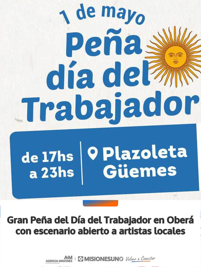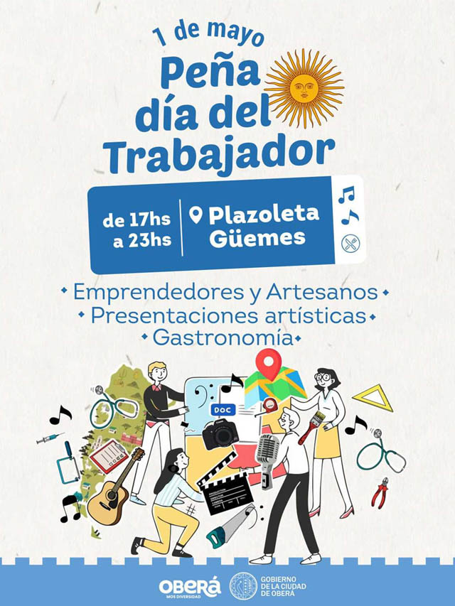 La Dirección de Turismo, Recreación y Cultura del Gobierno de la Ciudad de Oberá invita a la comunidad a participar de la Gran Peña por el Día del Trabajador, una actividad cultural y recreativa pensada para compartir en familia y destacar el talento local.
