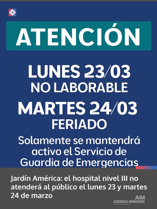 AGENCIA MISIONES.UNO | El Hospital Nivel III de Jardín América “Dr. Tadayoshi Kamada” informó que no habrá atención al público los días lunes 23 y martes 24 de marzo, debido a jornada no laborable y feriado nacional.