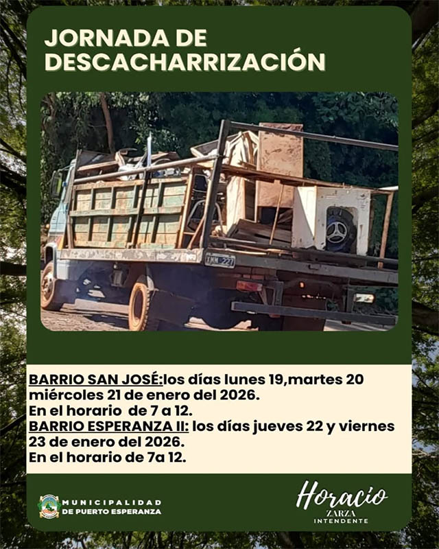 AGENCIAMISIONES.UNO | Puerto Esperanza. La Municipalidad llevará adelante una jornada de descacharrización que se desarrollará a lo largo de la próxima semana en los barrios San José y Esperanza II, con el objetivo de promover la limpieza y el orden en los espacios domiciliarios.
