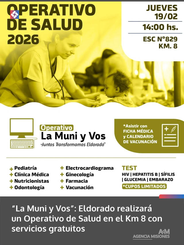AGENCIA MISIONES.UNO | La Municipalidad de Eldorado llevará adelante este jueves 19 de febrero, desde las 14 horas, un nuevo operativo “La Muni y Vos” en la Escuela N° 829 del Km 8, destinado a vecinos de los barrios Belgrano, Schöller y Paso del Salto.