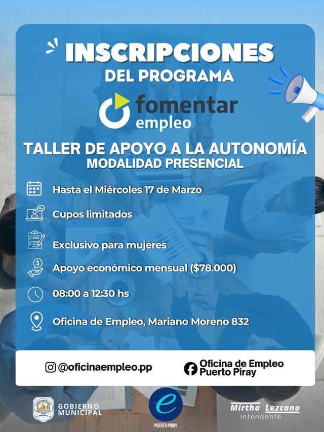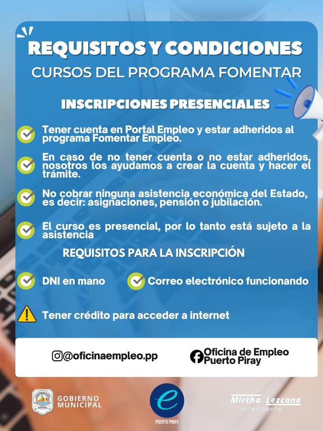 AGENCIA MISIONES.UNO | La Oficina de Empleo de la Municipalidad de Puerto Piray informó sobre los cursos de capacitación disponibles destinados a vecinos que buscan mejorar sus habilidades y ampliar sus oportunidades laborales.