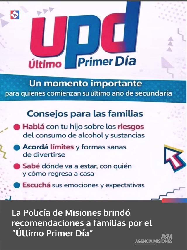 AGENCIA MISIONES.UNO | En el marco del denominado “Último Primer Día” (UPD), la Dirección Policía Comunitaria, a través de la División Escuela Segura, difundió una serie de recomendaciones destinadas a las familias de estudiantes que comienzan su último año de secundaria.