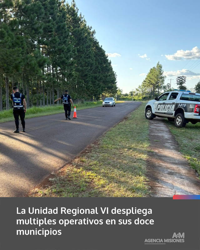 AGENCIA MISIONES.UNO | La Unidad Regional VI de la Policía de Misiones despliega un amplio esquema de operativos de seguridad en los doce municipios bajo su jurisdicción, con acciones preventivas en zonas urbanas y rurales.