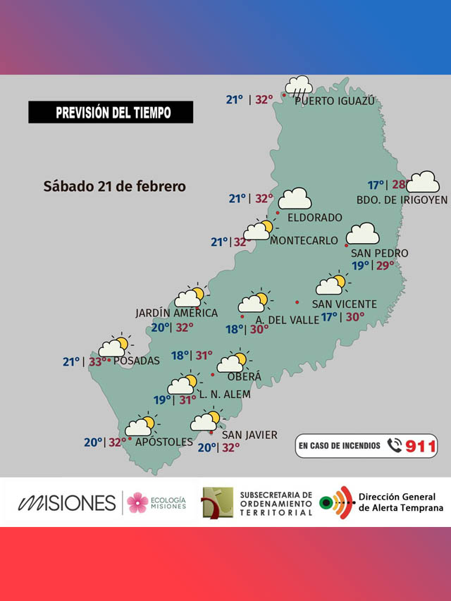 Para el sábado 21 de febrero se prevé el regreso del tiempo estable en gran parte del territorio misionero, debido a la influencia de una masa de aire seco. No se esperan precipitaciones, con una probabilidad de lluvia entre 10 y 35 por ciento y probabilidad media de nieblas y neblinas. Los vientos soplarán del sur y sureste entre 5 y 17 km/h, con ráfagas de hasta 30 km/h. La máxima estimada será de 33 °C en Posadas, con sensación térmica de 35 °C, y la mínima de 17 °C en Bernardo de Irigoyen.