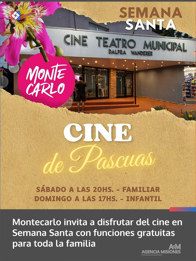 AGENCIA MISIONES.UNO | La Municipalidad de Montecarlo propone una agenda cultural para esta Pascua con dos funciones de cine gratuitas, pensadas para compartir en familia y reflexionar en el marco de Semana Santa.