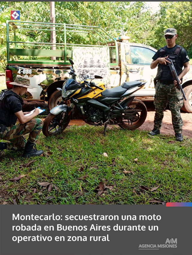 AGENCIA MISIONES.UNO | Efectivos policiales secuestraron una motocicleta con pedido de secuestro por robo en la provincia de Buenos Aires, durante un control preventivo realizado en Colonia Guaraypo, en la localidad de Montecarlo.