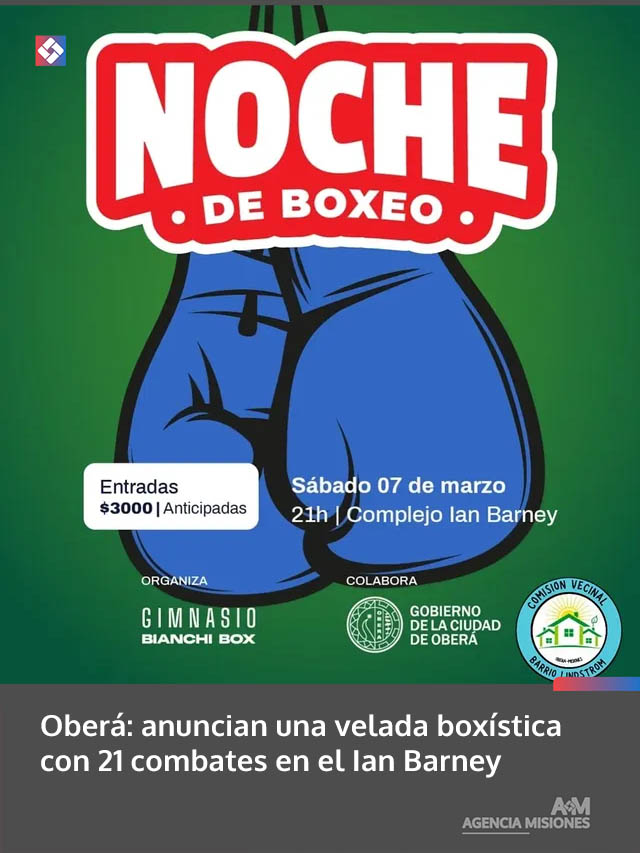 AGENCIA MISIONES.UNO | La Dirección de Deportes confirmó que el sábado 7 de marzo se realizará una nueva noche de boxeo en el estadio Ian Barney de Oberá, con 21 peleas oficiales fiscalizadas por la Federación Argentina de Box (FAB).