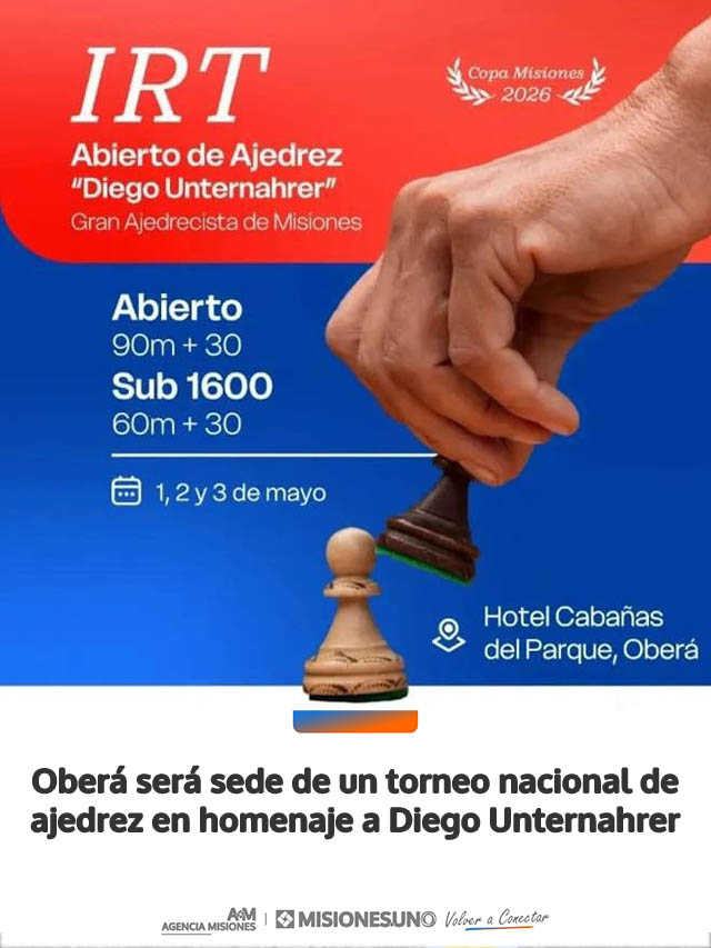 En el marco de su 85° aniversario, el Club de Ajedrez Oberá realizará el torneo IRT “Copa Misiones” – Abierto de Ajedrez Diego Unternahrer, uno de los eventos destacados del calendario nacional. La competencia se desarrollará del 1 al 3 de mayo en el Hotel Cabañas del Parque.